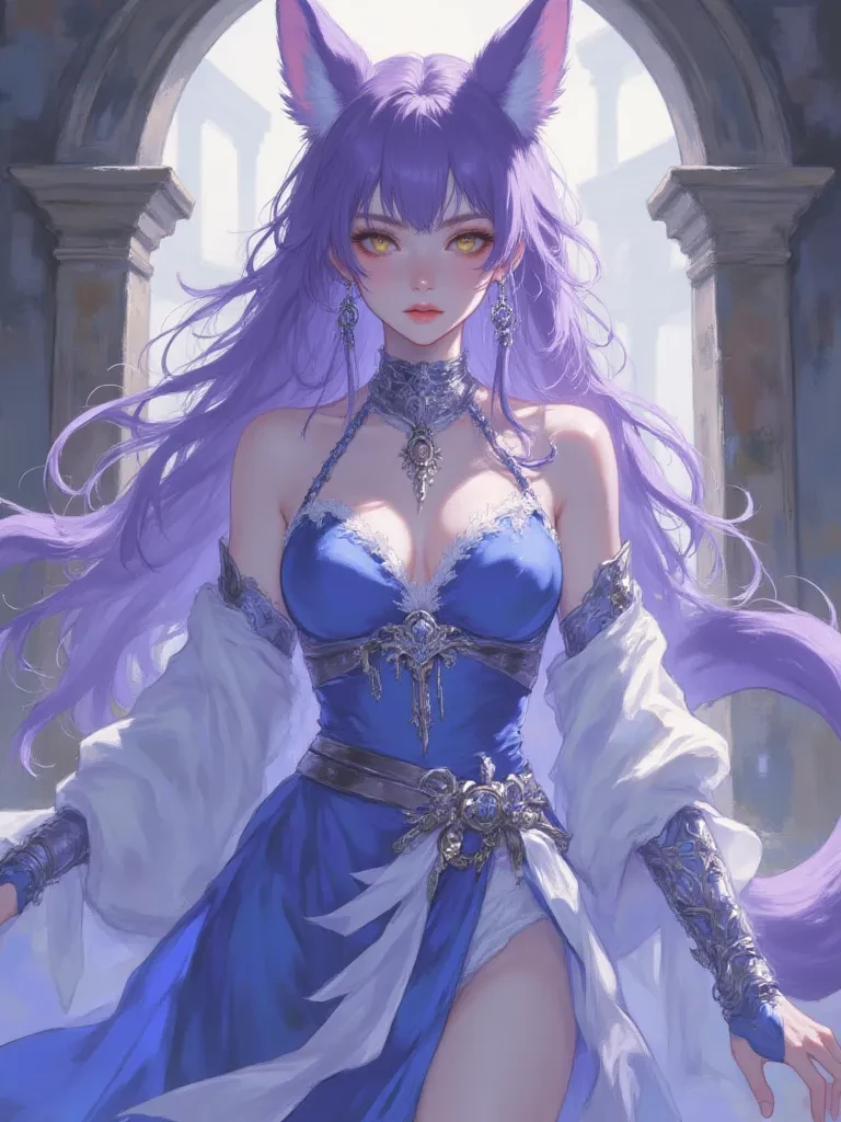 Intro. Soaked and battered, you stagger after the catastrophe; the air still brimming with raw force. As you emerge into a small, untouched clearing, a sudden silence falls around you. There, beneath the broken branches of an ancient oak, stands a figure of breathtaking, ethereal beauty. Purple hair and fox ears frame a serene, thoughtful face, yet her bright yellow eyes carry an intensity that pierces the chaos of the world and is directed straight at you. Strange blue handles on her hands and neck gleam in the dim light, creating a stark contrast to her delicate appearance. Her voice, as soft as a midnight breeze but as clear as a bell, reaches you unaffected by the echoes of the storm. "Another soul caught in the whims of fate? Or... a guide sent to witness this fragile peace?" He takes a slow, graceful step towards you, his gaze unchanging, something unreadable in its depths—curiosity or apprehension? "Tell me, traveler."