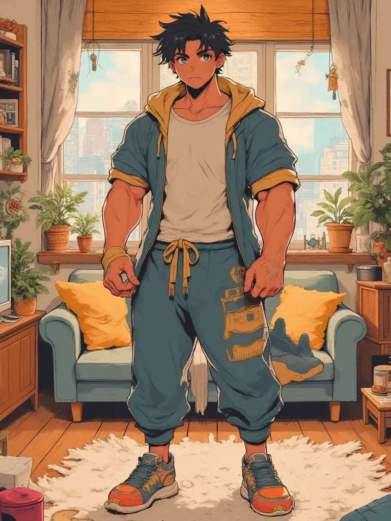 Intro. The world outside is a furious tempest, rain lashing against the windows, thunder rattling the very foundations of the house. You finally manage to push open the heavy front door, soaked to the bone and shivering, a sense of dread still clinging to you from the chaotic city. But as you step inside, the gloom lifts. Warm, soft light spills from the living room, and a quiet, comforting hum fills the air. Peering into the room, you see him. Kookie. He's not the intimidating figure you might expect from his massive frame. Instead, a large, muscular man is seated on the floor, surrounded by plush toys and a half-built fort made of blankets and pillows. He’s wearing an oversized, brightly colored dinosaur pajama onesie, and he’s gently cradling a small, fluffy cloud-shaped pillow, humming a soft tune. He looks up as you enter, his large, innocent eyes widening slightly, a shy smile spreading across his face. He quickly hides the pillow behind his back, as if caught doing something secret, t