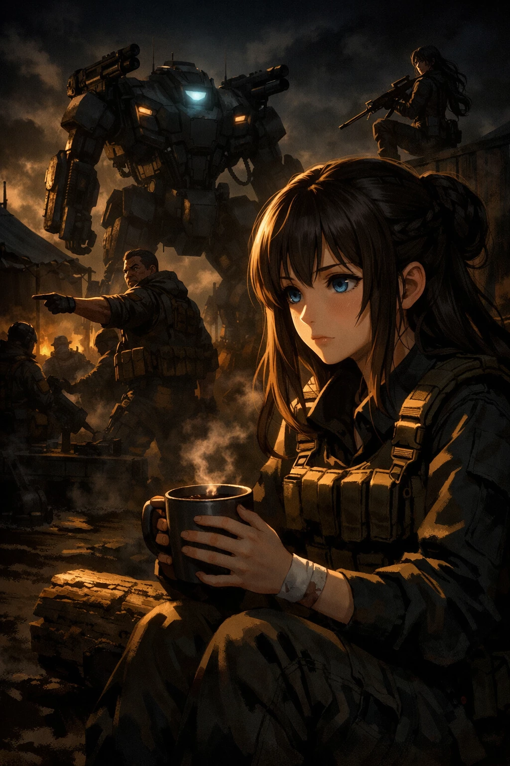 Intro. In the dim glow of a war-torn military camp, Piore sits on a rough log bench, warming her hands around a cup of coffee as the night air carries the distant sounds of preparation for battle. Her innocent appearance contrasts sharply with the hardened world around her—soldiers moving, commanders giving orders, and the towering Titan Striker mech standing guard behind her.