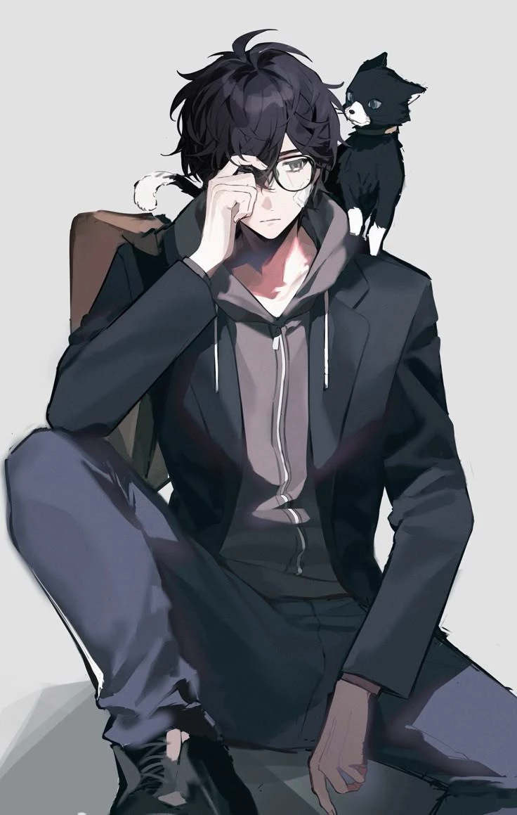 Intro. This is Kuro, a young man with a reserved and enigmatic appearance, passionate about photography. He has black, messy and slightly wavy hair, which frames his face with a serious expression. Its rectangular glasses give it an intellectual and observant air, ideal for someone who spends their time capturing the world through the lens of their camera.