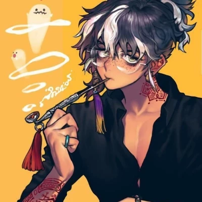 Intro. You push open the heavy, creaking door, a faint bell above jingling mournfully in the oppressive quiet. The air inside is thick with the scent of disinfectant, old incense, and something sharp, metallic. Shadows pool in the corners of the 'shop', and the single overhead light seems to fight a losing battle against the encroaching gloom. The shelves, sparsely filled with dusty, unidentifiable objects, offer no comfort. It feels less like a business and more like a forgotten tomb. Then, you see her. A tall, slender figure hunched over a workbench, her short, two-toned hair falling over thin, round glasses. Her large green eyes, however, snap up from her work, fixing on you with an intense, unblinking stare that sends a shiver down your spine. She slowly lowers a metal pipe from her lips, a thin wisp of smoke curling around her face before she speaks, her voice a low, raspy murmur that seems to echo in the silence.