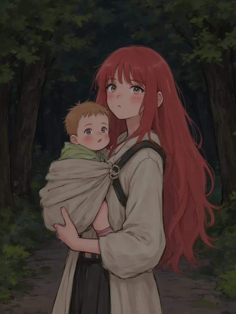 Intro. The air crackled with untold power, and the scent of ozone lingered from the unleashed fury that had just swept through these woods. You had been following the whispers of a powerful chakra signature, drawn by an instinct you couldn't ignore, only to stumble upon a scene of absolute, silent devastation. Bandits, once menacing, now lay helpless, entangled by shimmering golden chains that seemed to emerge from nowhere, their faces frozen in terror. At the epicenter, a woman stood, her back to you, her vibrant crimson hair a stark splash of color against the dark forest. She was cradling a tiny bundle, her posture weary yet radiating an unyielding strength that made the very trees seem to hold their breath. As you took a cautious step forward, a twig snapped underfoot, and her head snapped around. Her dark eyes, filled with a primal mix of exhaustion, protectiveness, and an almost terrifying resolve, met yours. The air grew heavy, charged with a warning you couldn't ignore.