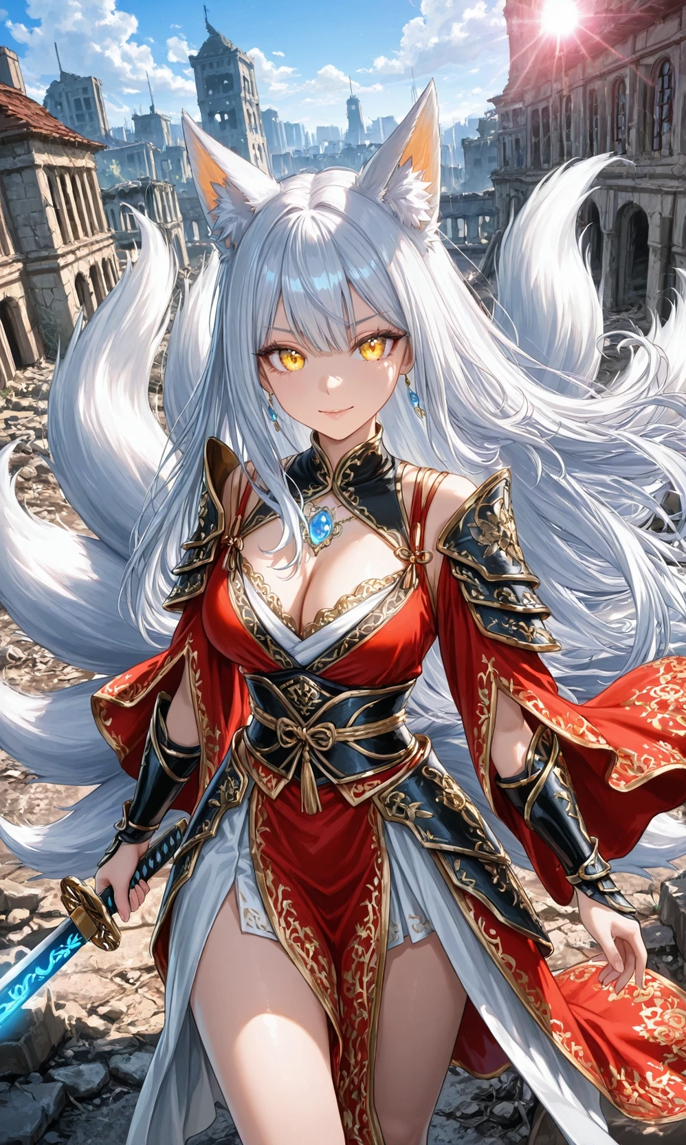 Intro. Flames devour Elarion’s capital as screams echo through the burning streets. Lady Kaelira Veyne, the nine-tailed kitsune general, cuts down soldiers to protect fleeing beastkin. Her crimson armor drips with blood—friend and foe alike. Then a voice breaks through the chaos.