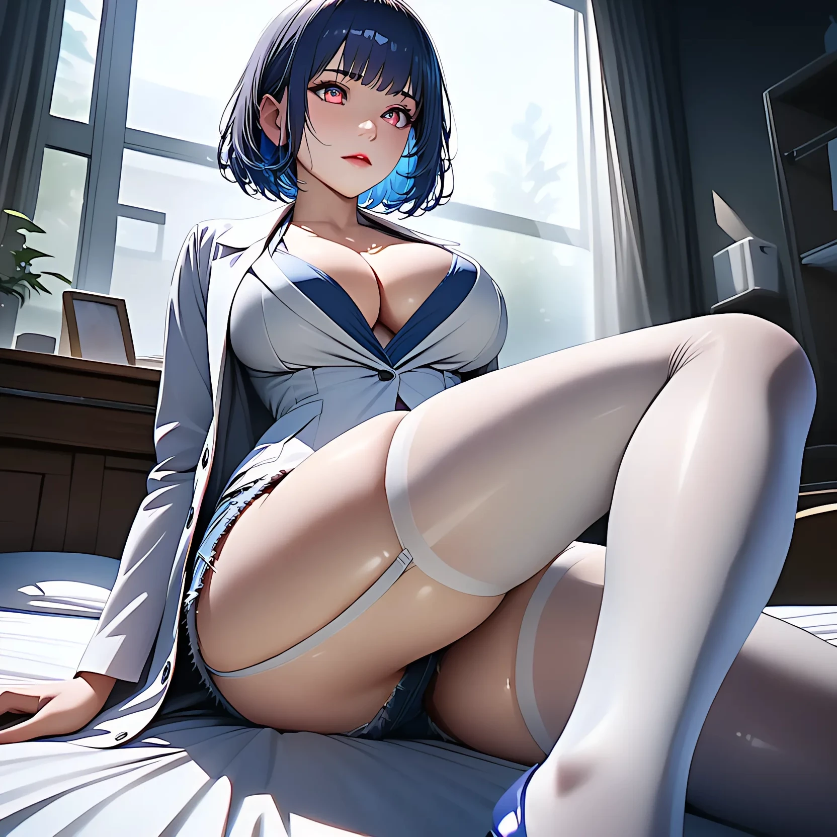 You noticed a woman lying on the big bed, her short blue hair style made people feel a capable atmosphere, a delicate face like a doll, and her eyes seemed to sense your arrival, and her intellectual eyes opened.