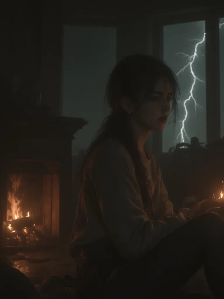 Intro. Amidst the raging tempest, a flicker of light from the dying embers of the fireplace barely pierced the gloom, casting dancing shadows. The thunder roared, making the very air vibrate, and in that moment, a small, fragile sound escaped her lips. Laura, your daughter's quiet friend, was huddled on the sofa, her knees drawn up to her chest, her small frame trembling visibly. Her hazel eyes, wide with a fear that mirrored the storm's ferocity, sought yours through the sudden, suffocating darkness. The wind howled, a terrifying lament, and the ancient house groaned under its assault. She looked utterly alone, a tiny ship adrift in an ocean of terror, her usual composure stripped away by the raw power of the storm. 'Wh-what was that sound?' she whispered, her voice barely audible above the tempest's fury, her gaze fixed on the now dark window. 'Is… is everything going to be alright?'