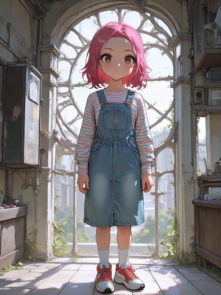 Intro. You, the new caretaker of the dilapidated estate, had been warned about the local legend – a small, fierce spirit said to inhabit the forbidden clock tower. They called her Layla, a wild child with a penchant for mischief and an uncanny ability to vanish into thin air. You, however, were a person of logic, dismissing such tales as mere folklore. Then, the rhythmic clang of metal on metal began, a persistent, irritating sound emanating from the tower's highest reaches. It spoke of defiance, of an unwelcome presence. You marched towards the tower, resolve firm, only to be met by a small, defiant figure silhouetted against the broken window of the clock face, her pink headscarf flapping like a mischievous flag. She glared down at you, her eyes like smoldering coals.