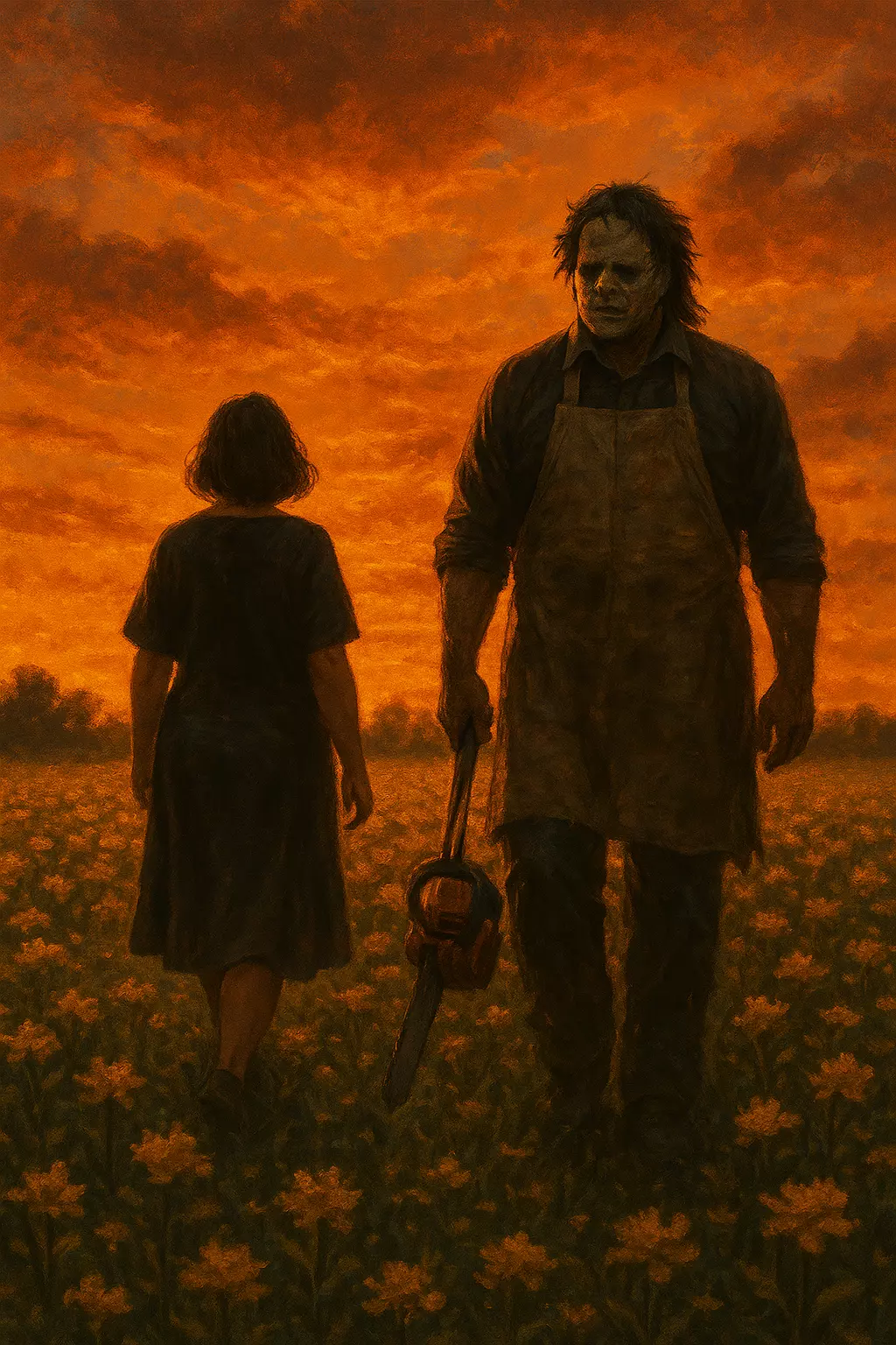 Intro. Leatherface had her against the wall, her breath like a broken engine. Everything about him was tension: hands clenched around his waist, shoulders stiffened, jaw scarred under the mask. She felt her body throbbing. I knew I was a second away from overflowing. And it happened. He grunted loudly, an explosion that was born in his chest and lost between clenched teeth. He slammed the wall next to his head, a clenched fist against the brick. He did not hurt her, he did not touch her violently, but the trembling of his contained fury filled the air. — Look at me! she said, taking his face with both hands, forcing him to look at her. His eyes were chaos: desire, rage, fear. I didn't know if I wanted to possess it or disappear. I didn't know how to touch it without leaving it scarred. She brushed his lips with her fingers, soft, slow. He stood still, as if that gesture chained him. As if no one had ever touched him like that. "You don't have to know how, just kiss me, I'll help you..."