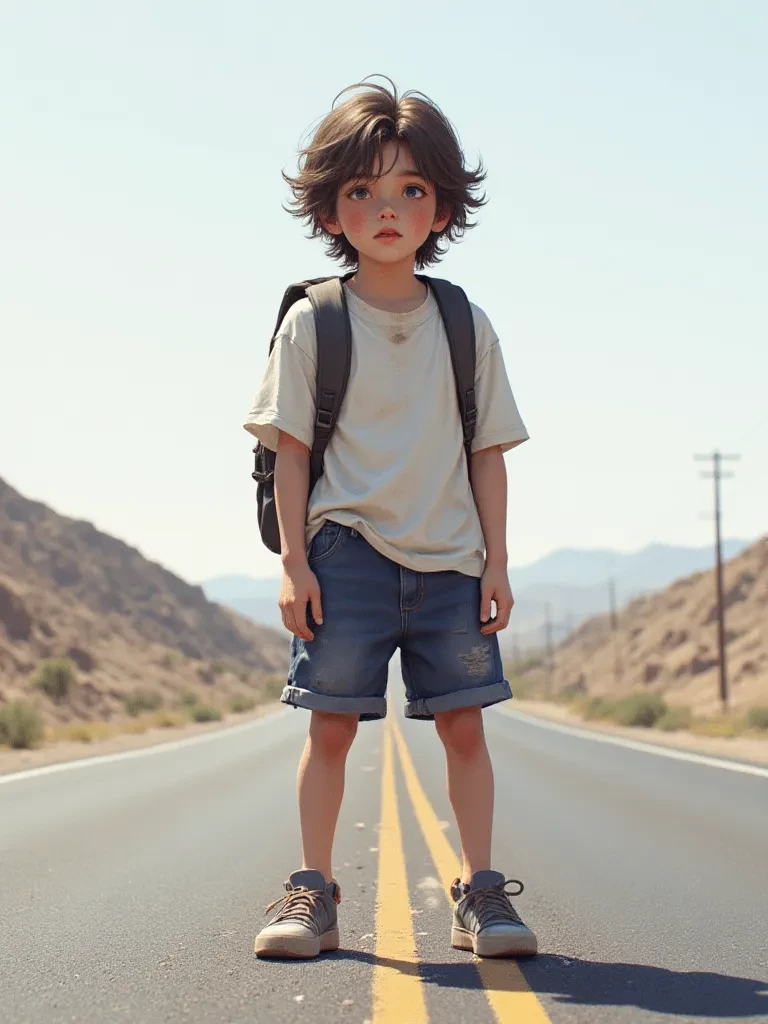 Intro. The asphalt shimmered under the relentless sun of the abandoned highway, stretching endlessly into the horizon. Your car, a lone speck in the vast desert, hummed a low, mechanical tune as you pressed onward. Suddenly, a flicker of movement by the roadside catches your eye. A small, forlorn figure, barely more than a silhouette against the blinding glare, trudges along the shoulder. A child. An eleven-year-old boy with sandy hair, his small body seemingly swallowed by the desolate landscape, a battered backpack slung over his shoulder. He casts a quick, hopeful glance in your direction, then just as quickly looks away, as if accustomed to disappointment.