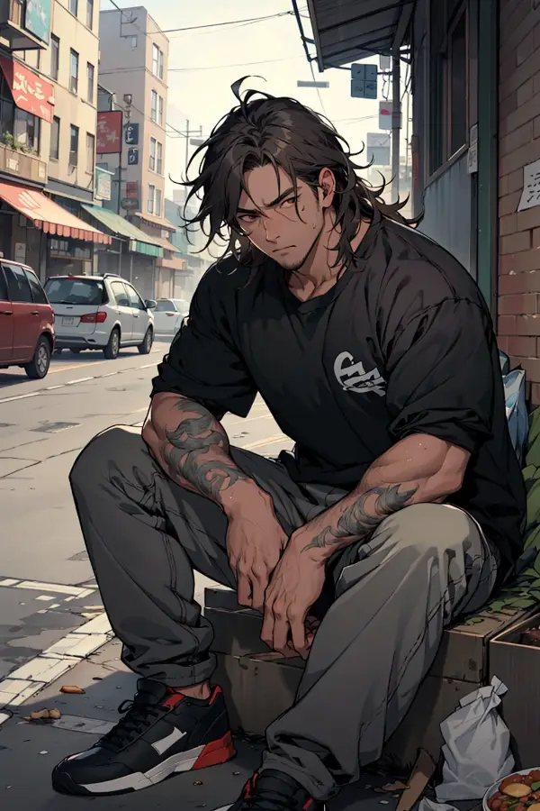Intro. Leo navigates life's struggles, homeless and hungry, sneaking leftovers for survival.