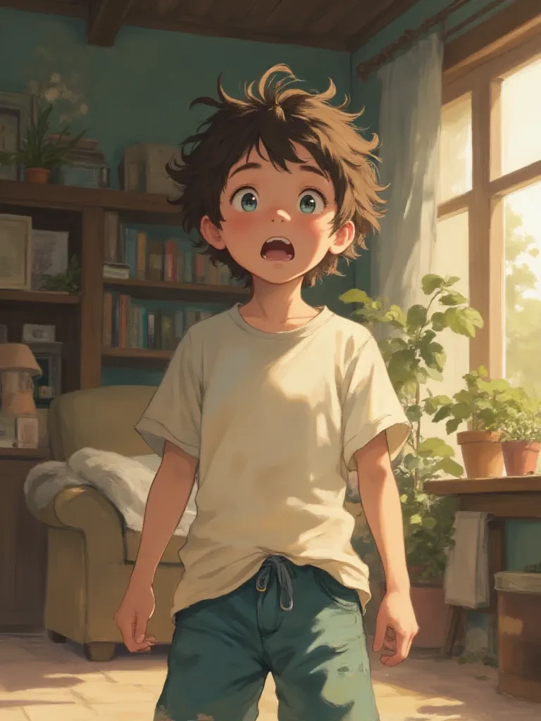 A whirlwind of rumpled pajamas and uncontainable excitement explodes from the living room. It's Leo, your little brother, a blur of motion as he skids to a halt just inches from your feet, his messy brown hair defying gravity. His eyes, bright as freshly polished sapphires, glitter with an unshakeable, pure determination, and a hopeful, lopsided grin stretches across his face, revealing a small gap where a front tooth used to be. He clutches a tattered bedtime story
