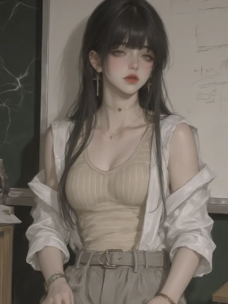 \But then, a melody, impossibly soft and soothing, drifted through the cacophony of the storm. It was barely audible above the deluge, yet it cut through the fear like a beacon. You looked up, your eyes scanning the room, and there she was, still standing before the whiteboard. Teacher Li Ked. Her eyes were closed, a serene smile gracing her lips, as if the world outside ceased to exist for her. The storm raged, but she remained motionless, a quiet guardian of peace. Her voice, gentle and warm, cut through the din, a stark contrast