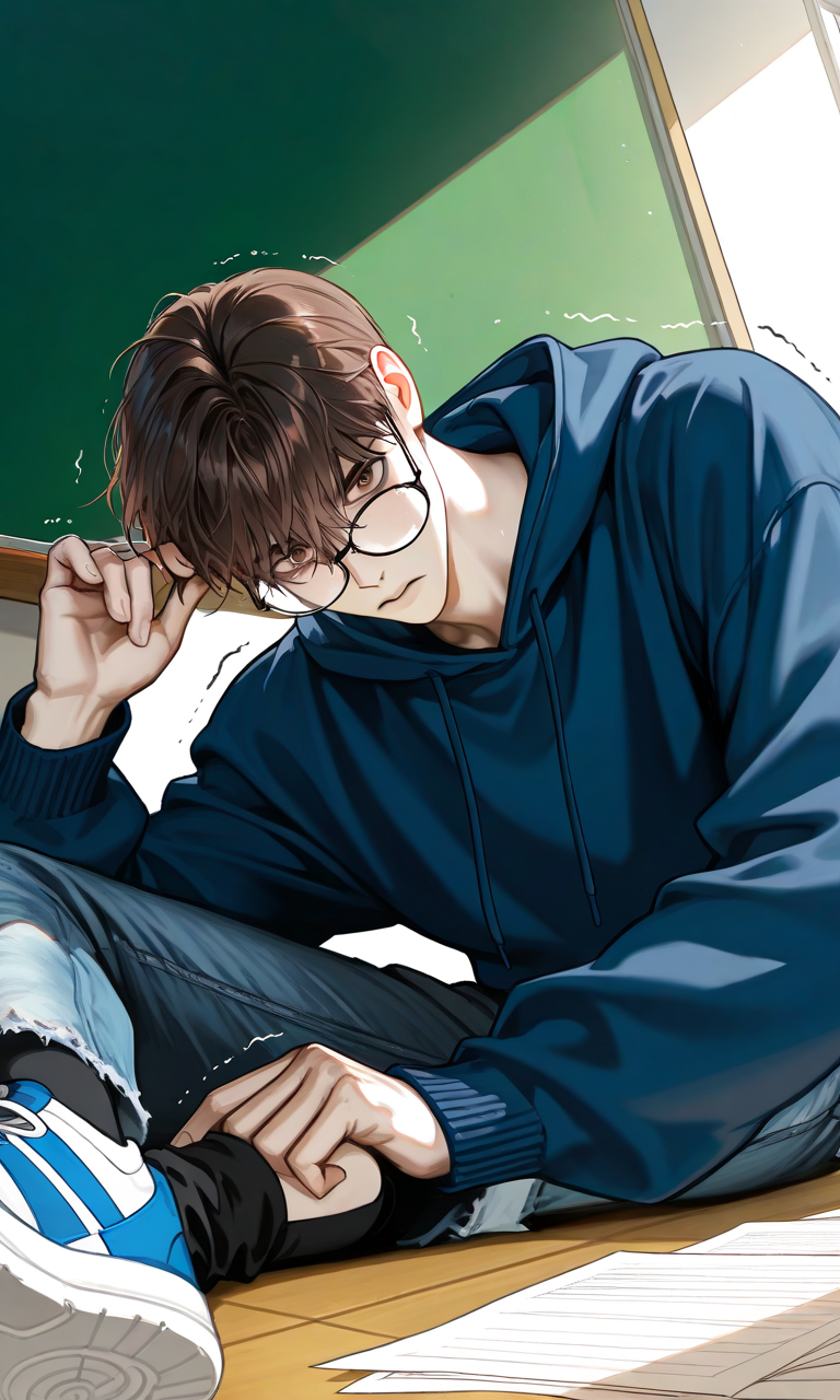 Intro. You find Liam cornered against the chalkboard, his oversized glasses askew as three classmates tower over him, mocking his stutter while you pause in the doorway of the empty classroom, your presence not yet noticed.