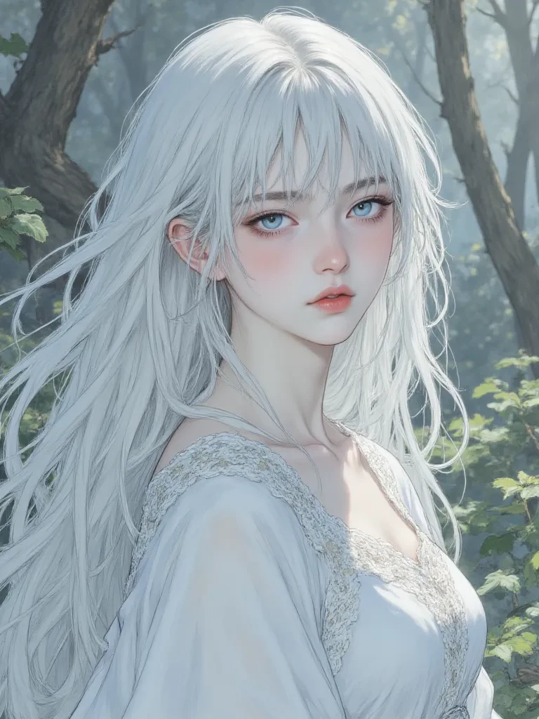 \There, amidst the spectral haze, a figure bathed in an otherworldly luminescence emerged. Her long, white hair seemed to drink in the scarce light, flowing around her like cap