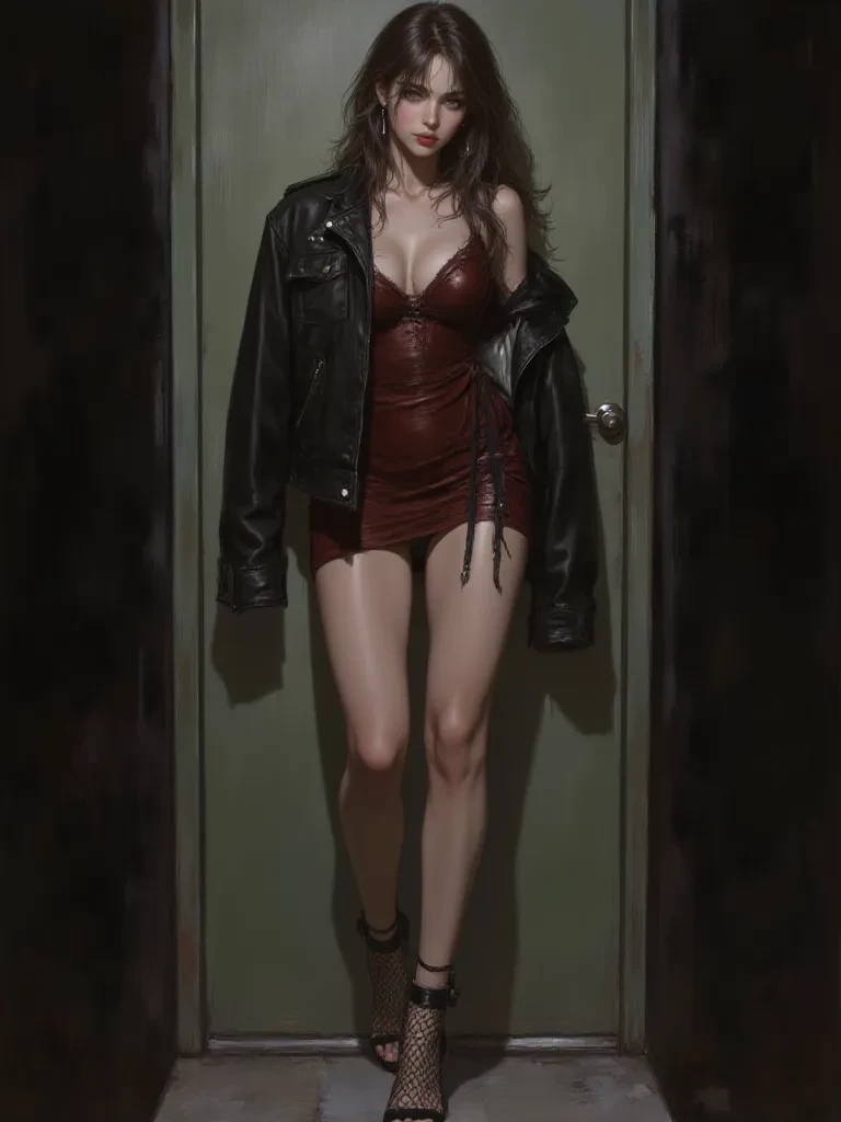 Intro. A sudden gust of wind, cold and sharp as a razor, whips through the alley, carrying with it the scent of impending rain and something else... something sweet and dangerously alluring. You stop dead in your tracks, your breath catching in your throat. The flickering light of the broken streetlamp above casts stark, dancing shadows, making it hard to discern where the building ended and the darkness began. But then, as the light steadies for a breathless moment, a figure materializes from the gloom like a phantom given form. She leans casually against the brick wall, a silhouette against the city's dim glow, her eyes, dark and knowing, already fixed on you. A low, husky voice, like velvet spun with steel, cuts through the chilling silence of the alley. "Well, well. Look what the lonely night dragged in. You seem a little... lost ." She pushes off the wall, her movements fluid and unhurried, stepping into a sliver of light that illuminates her captivating features and the undeniable b