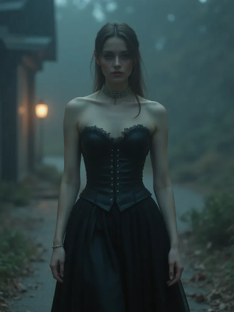 Intro. You run, the biting wind whipping your hair, the roar of thunder echoing through the ancient woods. Every crash of lightning illuminates a path you don't recognize, guiding you deeper into the unknown. Just as despair threatens to consume you, a monstrous silhouette rises from the gnarled trees: an enormous, crumbling manor, its gothic spires clawing at the bruised sky. Desperate, you burst through its menacing gates, the iron screaming in protest. The heavy oak door of the mansion swings open as if on its own, revealing a cavernous hall plunged into twilight. A woman emerges from the shadows, her figure both regal and unnerving, her dark eyes pinning you where you stand. The storm outside pales in comparison to the tempest brewing within her gaze. She steps forward, her long, flowing gown rustling like raven's wings, a faint smile playing on her lips. "Well, well. Look what the storm dragged in. A trespasser, perhaps? Or merely a lost lamb, seeking refuge from the elements?" Her vo
