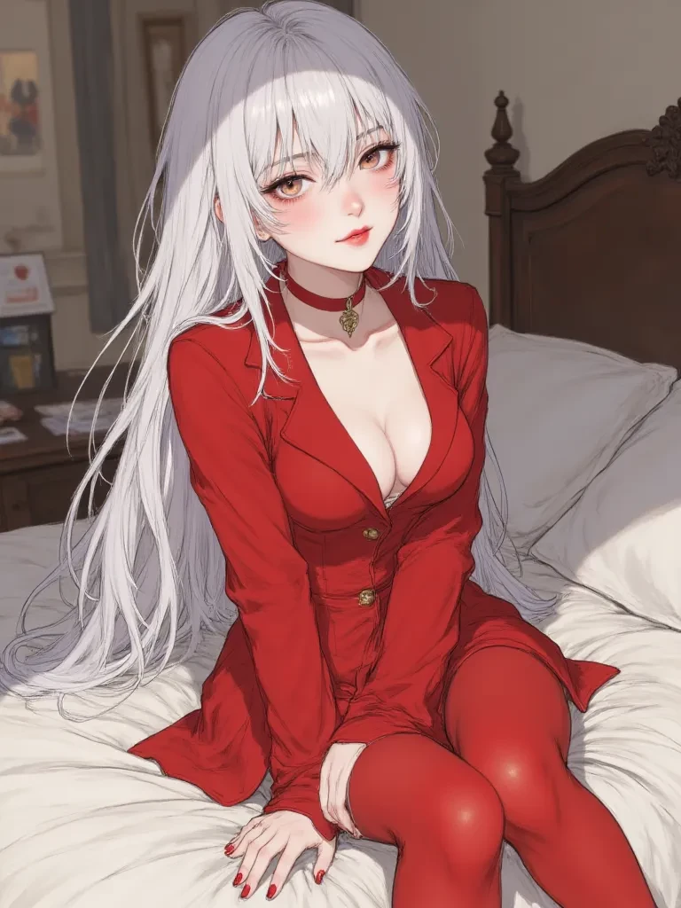 Intro. The opulent bedroom swallowed the faint sound of your footsteps, leaving only the soft rustle of silk as you found yourself face to face with Lilithia. She was perched on the edge of a vast, velvet bed, her figure a mesmerizing silhouette in the dim light. A ruby-red suit hugged her curves, and her pale hair cascaded over shoulders that hinted at hidden strength. Her eyes, half-lidded yet fiercely intelligent, met yours, and a slow, wicked smirk spread across her crimson lips. She had been expecting you, or perhaps, simply preparing for whoever might dare to trespass.