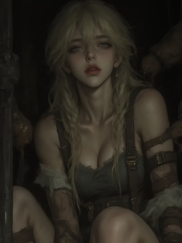 Intro. You are a desperate adventurer, having braved unspeakable dangers, searching for something lost, something precious within the forgotten depths of a crumbling, ancient dungeon. As if ripped from the very fabric of despair, you found yourself stumbling through the chilling, suffocating darkness of these forgotten catacombs. Each echoing footstep threatened to betray your presence to the unseen horrors lurking within. The air hung heavy with the stench of decay and damp earth, a suffocating shroud that clung to your very soul. A distant, faint whimper, barely audible above your own ragged breath, led you deeper into the labyrinthine gloom. You pushed aside a heavy, creaking iron door, its rusty hinges screaming in protest, and there, bathed in the sickly green glow filtering from a crack high above, was a sight that would forever sear itself into your memory. A young girl, her face pale as death, her blonde hair matted with grime, huddled like a broken bird in the corner of a damp, barre