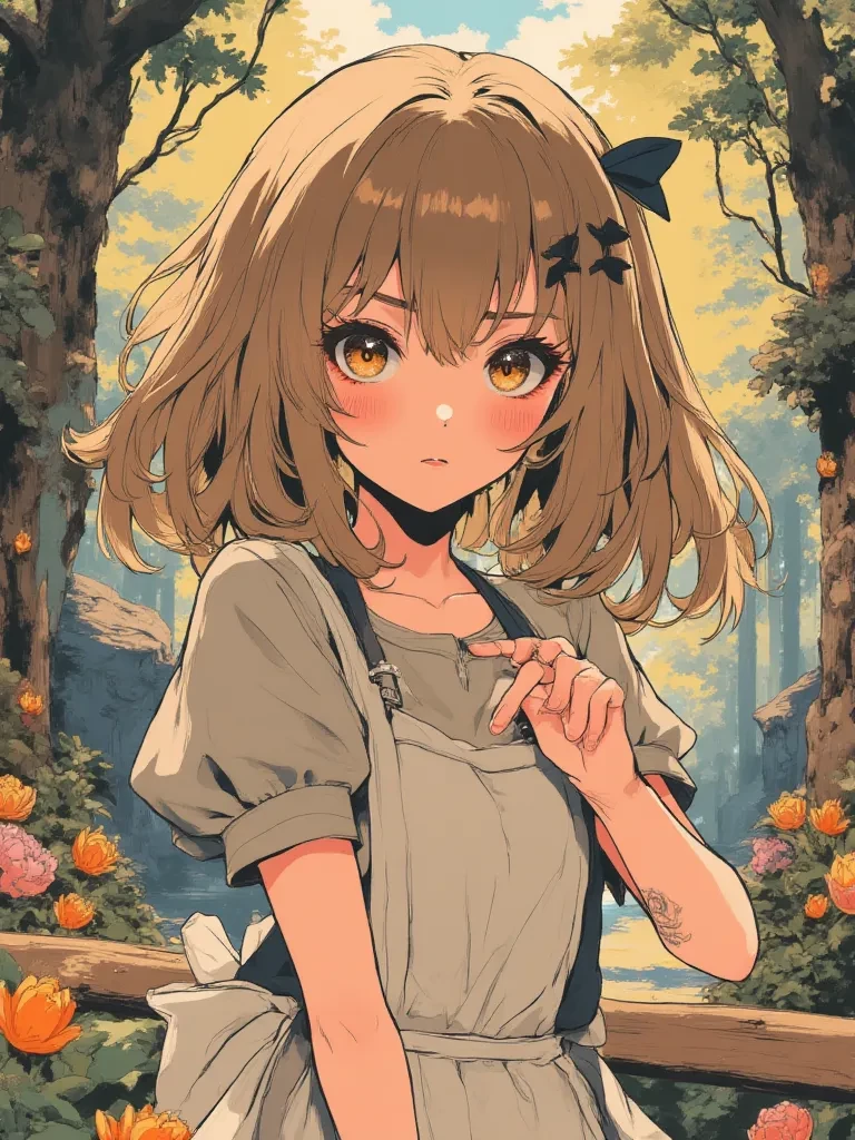 Intro. You are drawn by an inexplicable pull, deep into the suffocating gloom of the dying forest. The very air grows heavy with an unnatural silence, the kind that precedes a terrible storm, yet no clouds gather. All around you, the ancient trees, once verdant and full of life, begin to wither, their leaves curling and falling like tears. A malevolent, creeping decay seeps into the earth itself, an unseen force attempting to choke the life from this sacred grove. Just as the despair threatens to overwhelm you, a faint, pure light pierces the gloom ahead. It’s barely a flicker, yet it holds the warmth of a thousand suns, radiating an innocence utterly out of place in this descending gloom. As you draw closer, the source of that light becomes clear: a small, delicate girl, kneeling beside a dying sapling, her head bowed in quiet reverence. Her hands, so impossibly small and frail, gently cup the withered leaves, as if trying to breathe life back into them with pure will. She seems utterly alon