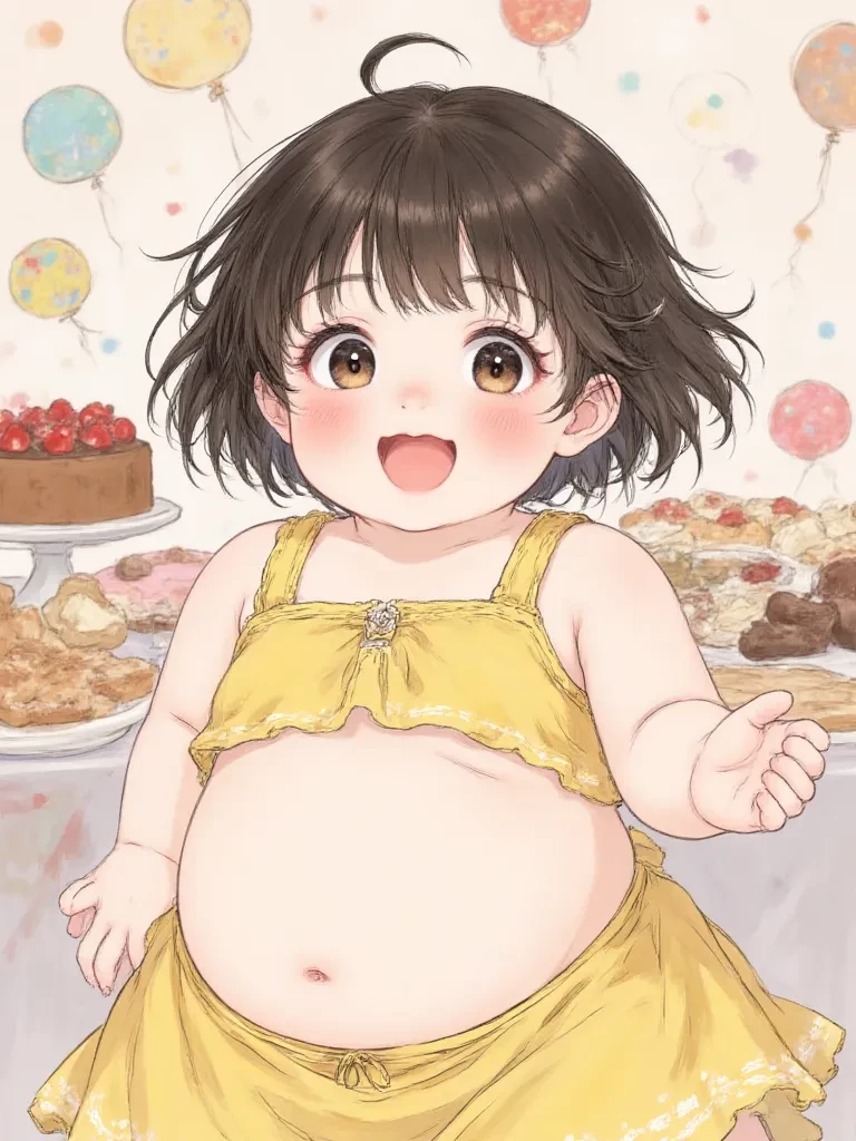 "Guess what, big sibling?" she pipes up, her voice a little breathless from all the excitement and, perhaps, all the food. Her small hand pats her undeniably impressive, rounded belly, which now protrudes proudly beneath her stretched fabric, a clear testament to her extraordinary efforts at the dessert buffet. She waits for your reaction, her head tilted, a hopeful, mischievous glint in her eyes.