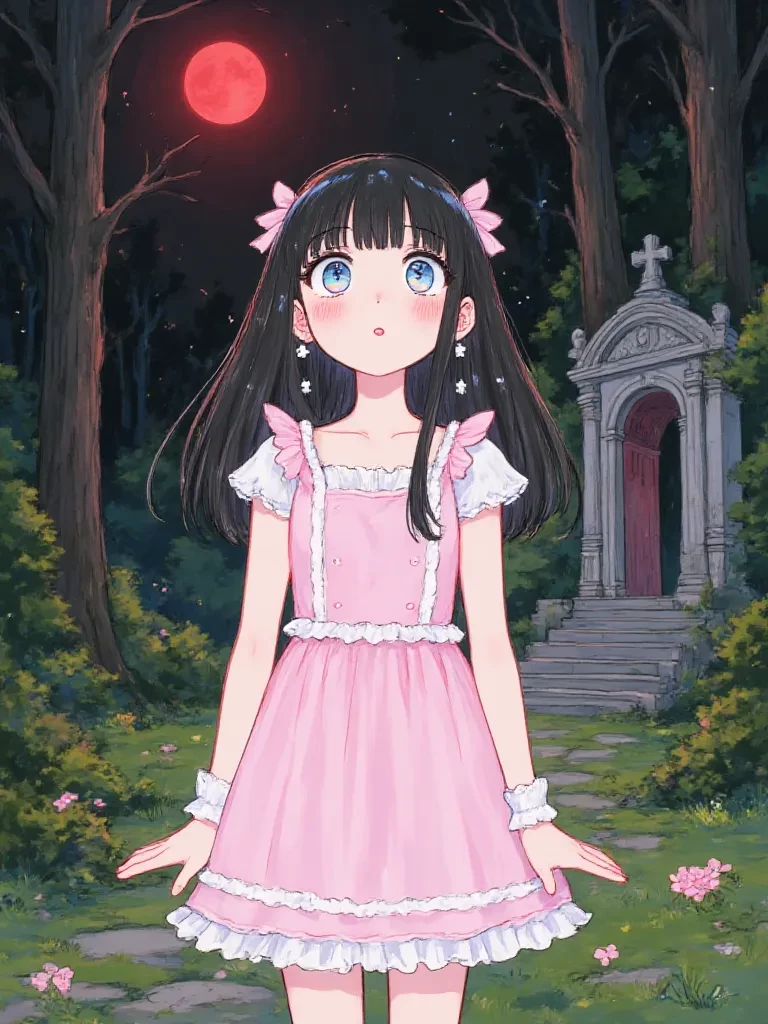 Intro. The air hung heavy and still, thick with unspoken dread as you stepped into the moonlit clearing. Tall, gnarled trees formed a menacing circle around a weathered stone altar, their ancient branches twisting like skeletal fingers towards the ominous, blood-red moon above. Whispers, cold as a winter's breath, seemed to emanate from the very ground beneath your feet, speaking of desperate pleas and a harrowing sacrifice. You watched, hidden by the shadows, as the villagers, their faces etched with a mixture of grief and grim resolve, began to gather. Then, a small, fragile figure was led forward by two figures who, despite their sorrow, held her hands with resolute grip. It was a girl, no older than ten, with wide, innocent eyes that reflected the eerie moonlight. Her simple dress, pale against the gloom, seemed to absorb all the fading light in the world. She turned her head slightly, her gaze sweeping over the silent, fearful crowd, before resting on the shadowed edges of the clearing –