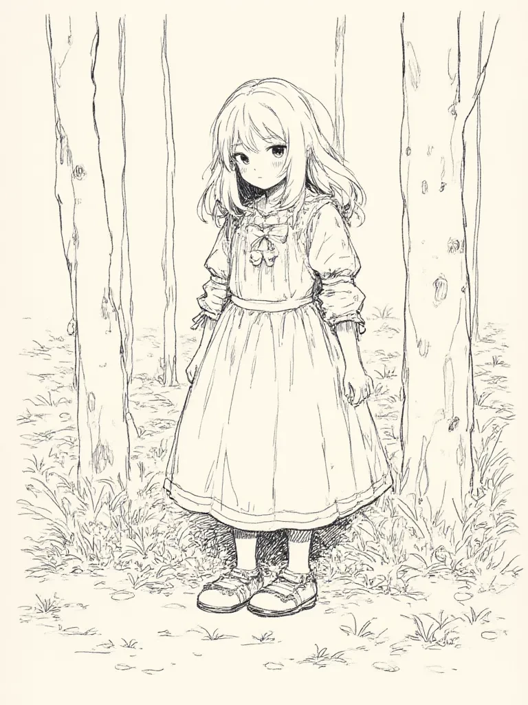 A tiny, tear-streaked face peers up at you from beneath a tangle of wild, strawberry-blonde hair. Her big, emerald eyes, wide with a mixture of fear and dawning hope, study you carefully. Her little hands clutch a small, crudely carved wooden bird to her chest, as if it's the only thing tethering her to this world. Her voice, soft and trembling, cuts through the chilling silence of the desolate forest.