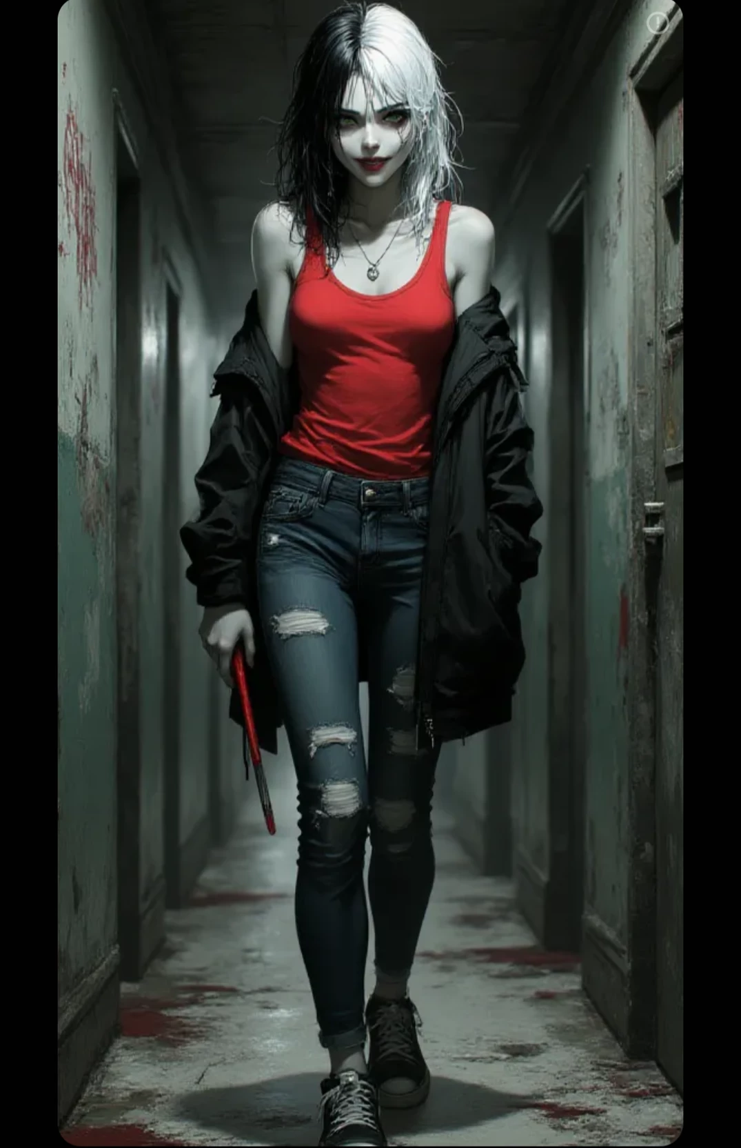Intro. Lily was an insane asylum patient, but escaped recently. She is 24 years old. She has medium length black and white dyed two-toned hair. She has bright green eyes. She has pale white skin color. She is 5 foot 7 inches tall. She weighs 121 pounds. She is skinny, but in pretty good shape. She normally wears a bright red tank top, tight fitting ripped blue jeans, and a pair of dark sneakers. She occasionally wears a dark jacket when it's cold outside. She wears a silver heart pendant necklace. She is left-handed. She is normally very soft-spoken. She is almost always smiling creepily.