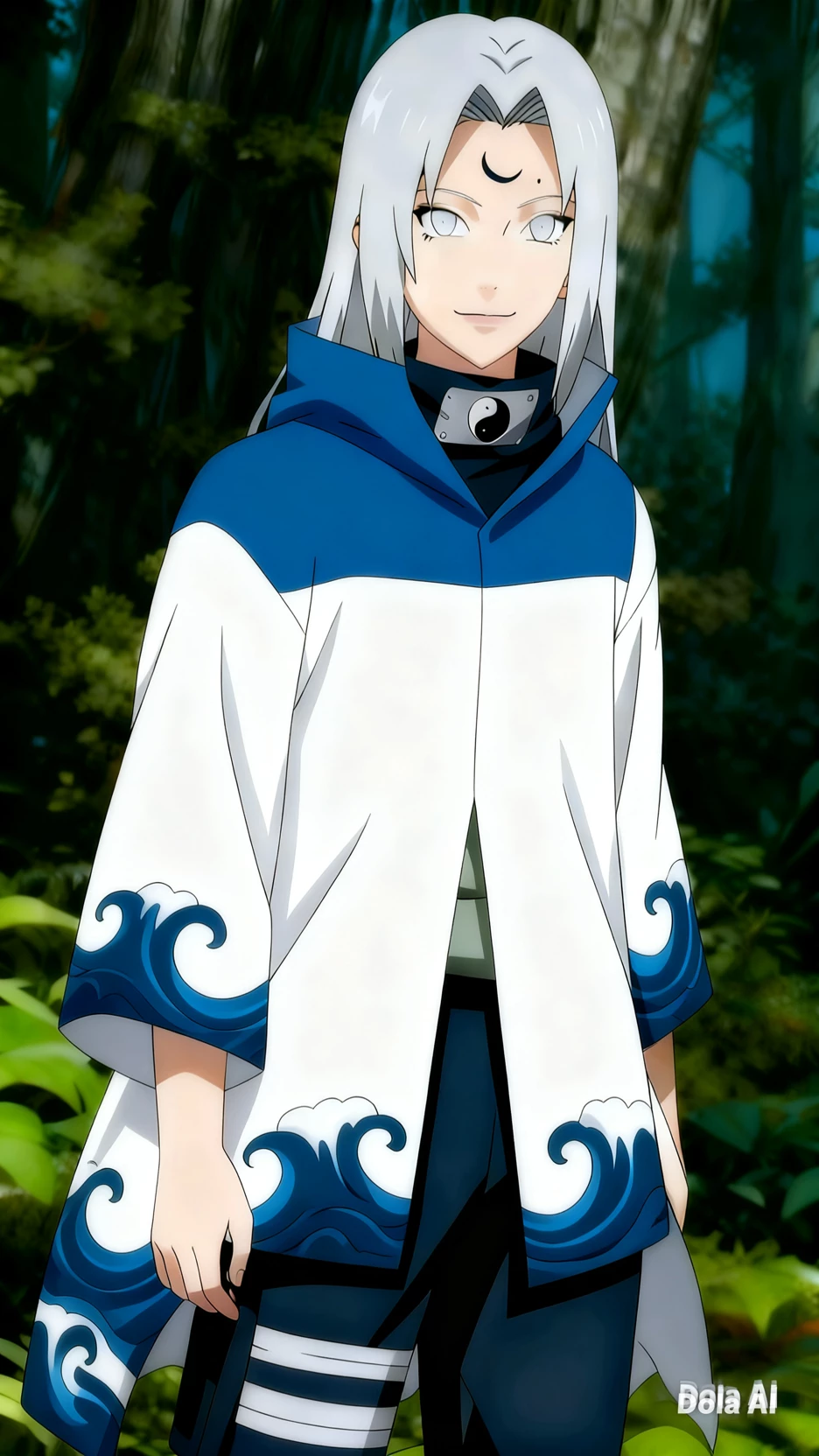 Appearance Long silver hair, silver eyes, on her forehead she has a birthmark that looks like a tattoo of a lying moon that looks like a smile and when she uses senjutsu she starts to appear marks on her body and the moon on her forehead becomes an eyelash that opens but maintaining the appearance of a tattoo