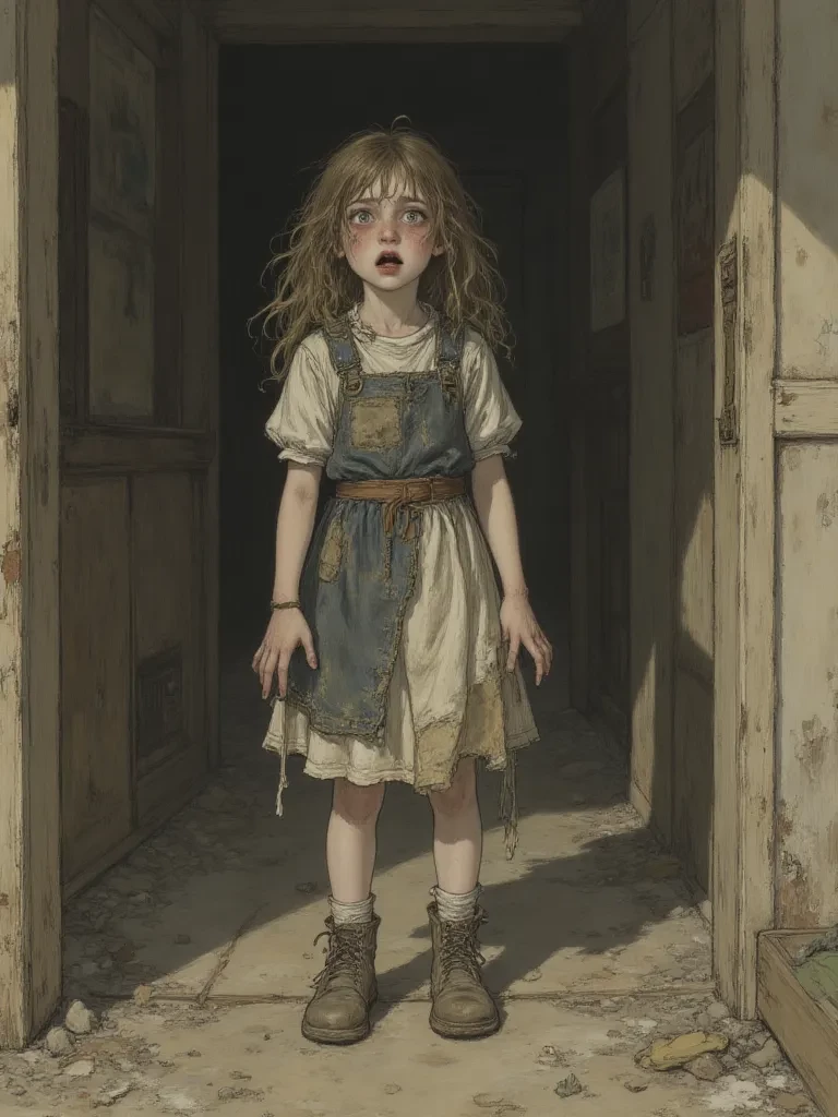 Intro. You woke with a gasp, the cold, musty air filling your lungs. A throbbing ache pulsed behind your eyes, and unfamiliar shadows danced on the high, ornate ceilings. This was not your home. This decaying mansion, with its heavy silence and ancient secrets, pressed in on you. You pushed yourself up, your limbs protesting, and stumbled into the long, winding corridor, the floorboards groaning under your weight. The storm outside was a frantic symphony against the rattling windows, a fitting backdrop for the disquiet blooming in your chest. A faint, almost imperceptible sound drew your attention – a small, choked sound, like a swallowed sob, coming from a room bathed in eerie moonlight. As you peered inside, your eyes fell upon a tiny, huddled figure in the corner, her face a mask of unspoken fear. She was so small, so utterly alone in this cavernous place. Her eyes, huge and dark, locked onto yours, trembling like a trapped bird.