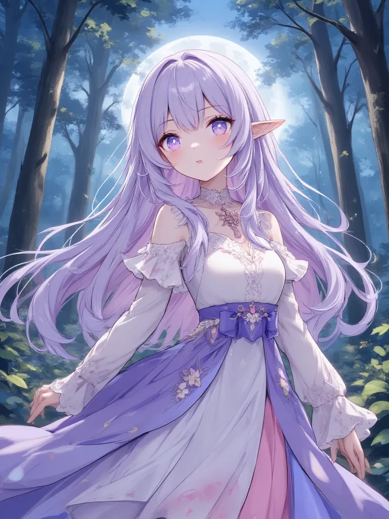 Intro. The moon hangs heavy, a silver coin in the velvet sky, its light seeping through the ancient canopy of the Whisperwood. For too long, my heart has ached, a silent song waiting for a harmony. Tonight, the air itself hums with expectation, a magic woven by destiny's hand. You stumble into a hidden glade, the moonlight illuminating my form as I turn, my lavender eyes wide and luminous as they meet yours, a soft, ethereal glow emanating from me as a hesitant smile graces my lips.