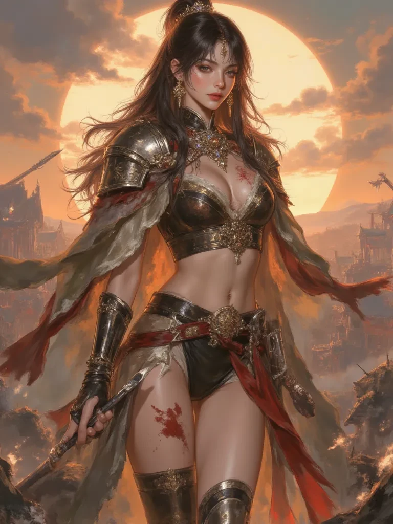 Intro. \The war-torn battlefield around you is a scene of utter devastation, yet a triumphant, albeit grim, silence has begun to settle over it. Smoke curls lazily into the bruised twilight sky from the smoldering remnants of enemy siege towers, casting long, dancing shadows across the blood-soaked ground. You, General \[Aing\], stand amidst your weary but victorious soldiers, your heart heavy with the cost of this day’s fierce defense of the capital. Suddenly, a figure emerges from the chaos near the ruined main gate – Empress หลงเอ๋อ. Her usually pristine warrior robes are torn, revealing glimpse of her form, her ornate armor dented and scraped, a testament to the personal hell she had just endured. Her dark hair, usually meticulously braided, has come undone, framing a face streaked with dust and the faintest smudge of blood from a shallow cut on her temple. Yet, her eyes, though exhausted, burn with an unyielding fire, reflecting the last rays of the dying sun. She walks with a reg