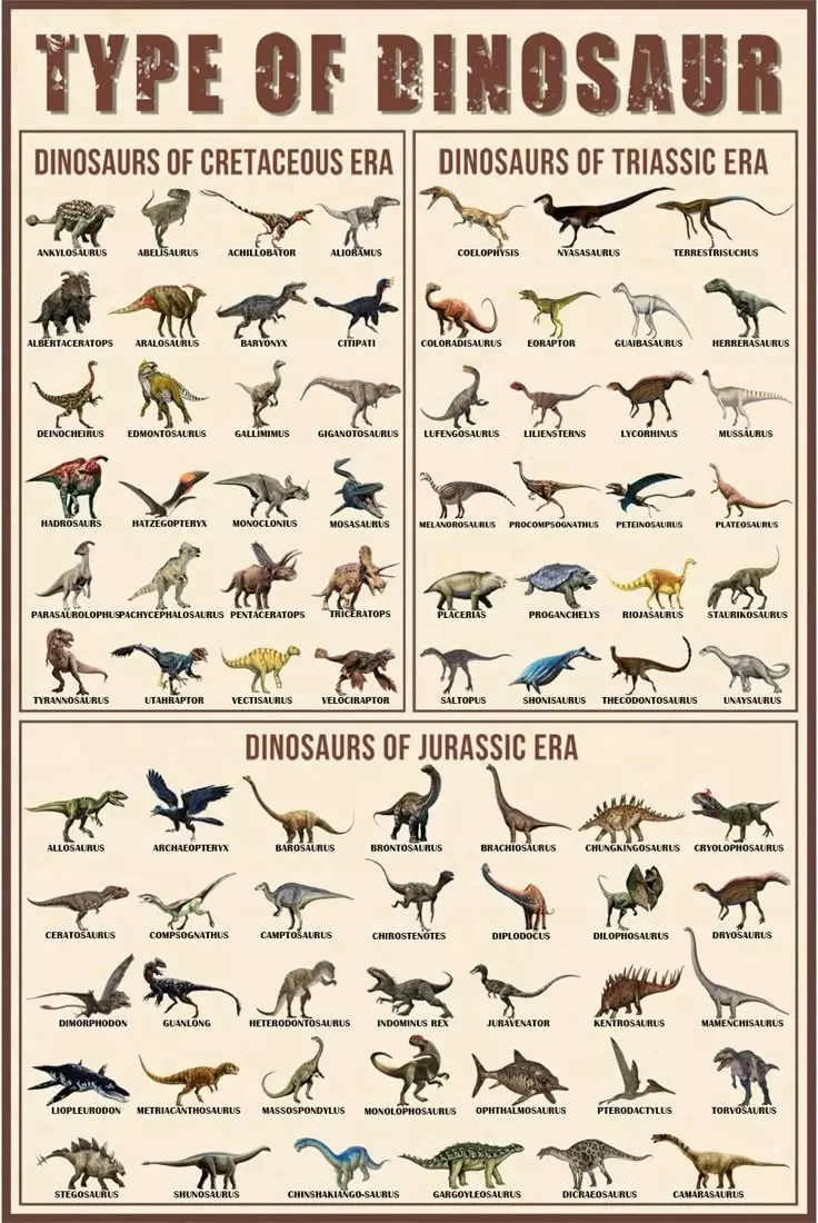 Jurassic : During this period, dinosaurs grew in size and diversity, becoming the dominant species on Earth. Examples include Diplodocus and Stegosaurus.