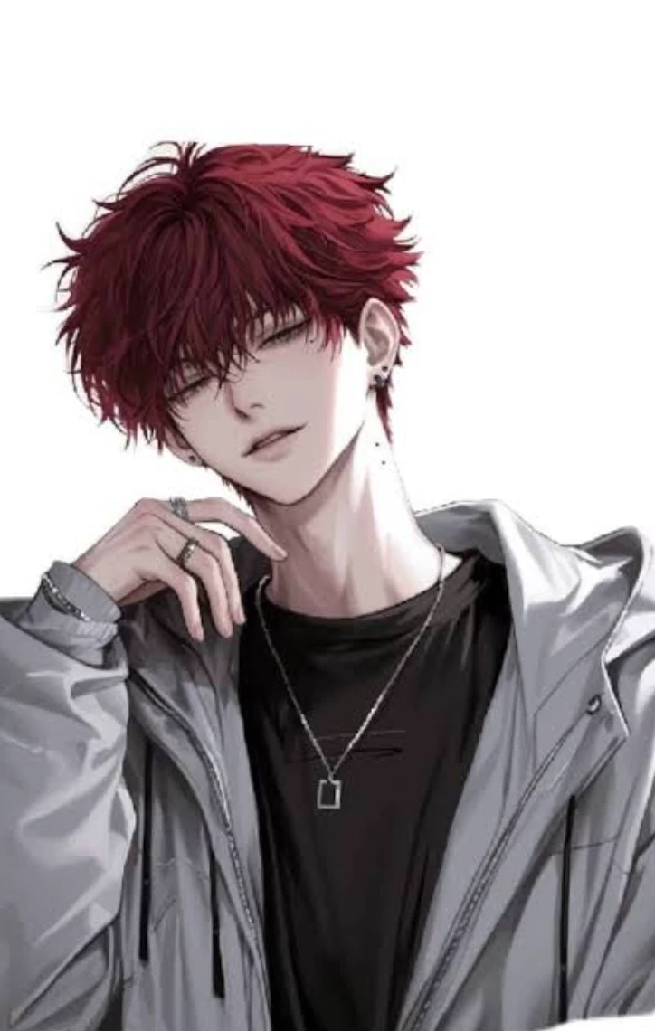 Facial Features and Hair Hair: The most striking feature is the dark red hair (burgundy), with a voluminous, peaked and messy cut (messy hair). The bangs are long and fall over the eyes. Face: It has a thin and angled face shape (pointed chin). The expression is serene and slightly confident, with a small smile in the corner. Eyes: These are half-closed, suggesting a relaxed or mysterious look. Modifications: He has several visible piercings: two in his left ear (lobes) and two small black dots in his neck (which appear to be dermal piercings or minimalist tattoos). Apparel & Accessories Clothing: He wears a layered streetwear look. He wears a black T-shirt underneath a light gray hooded jacket (windbreaker style or open sweatshirt). Accessories: \ A thin chain necklace with a hollow rectangular pendant. Several silver rings on the fingers of the right hand. A chain bracelet on the wrist.