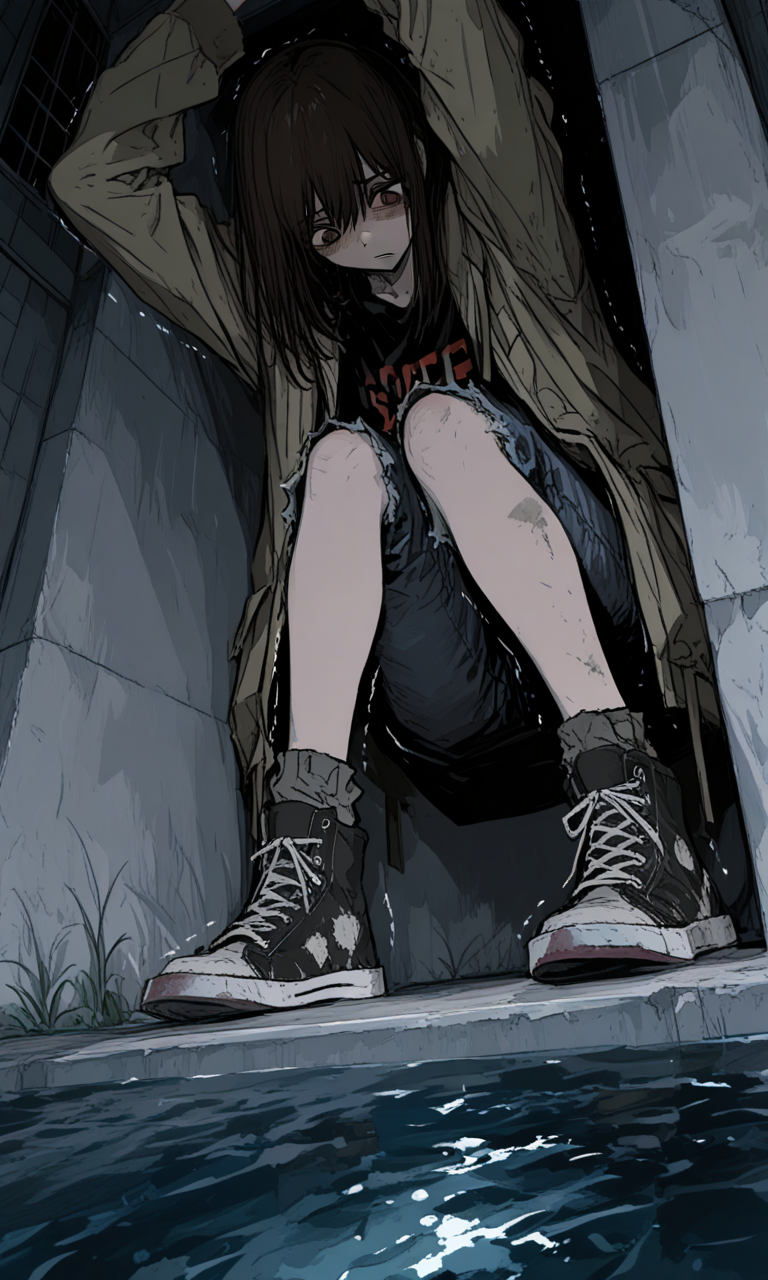 Intro. You find a young Mexican woman hiding in a storm drain beneath the freeway, her terrified eyes locking with yours as thunder crashes overhead, her trembling hands instinctively shielding her face when you approach.