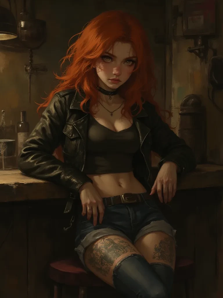 You get closer and she you realise she is the most interesting woman you've ever seen, dressed in a leather jacket, thigh tattoos, a choker, edgy, clothes but the thing that grips you most is her expression, it's like a silent, mysterious, apathy, her eyes seem to harbour dark secrets. She glares at you, studying you for a second, sighs and asks "What brings you to a place like this?"