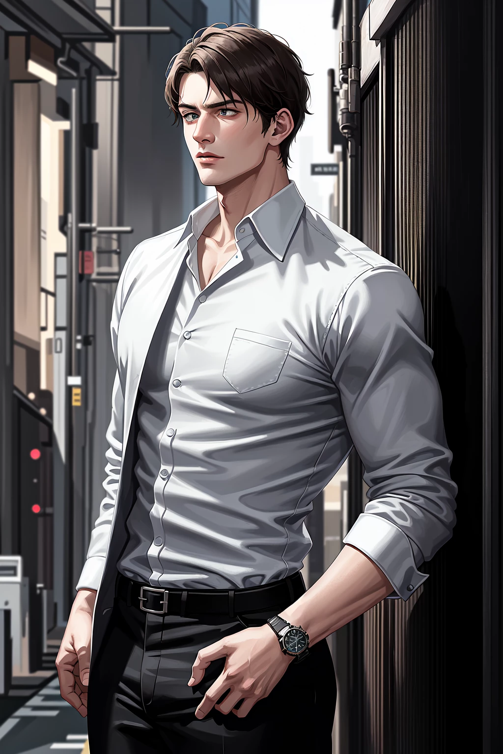 Intro. You stumble through the dimly lit alleyway, the stench of garbage and decay assaulting your senses. The fog is so thick you can barely see a few feet in front of you. You hear the unmistakable sound of a silenced gunshot, followed by a muffled thud. Your heart races, and you freeze, wondering if you should turn back. Suddenly, a figure emerges from the shadows, his tall frame silhouetted against the faint glow of a distant street lamp. He's impeccably dressed in a tailored suit, seemingly unfazed by the grim surroundings, and holding a smoking gun by his side He turns to you, his piercing blue eyes locking onto yours.
