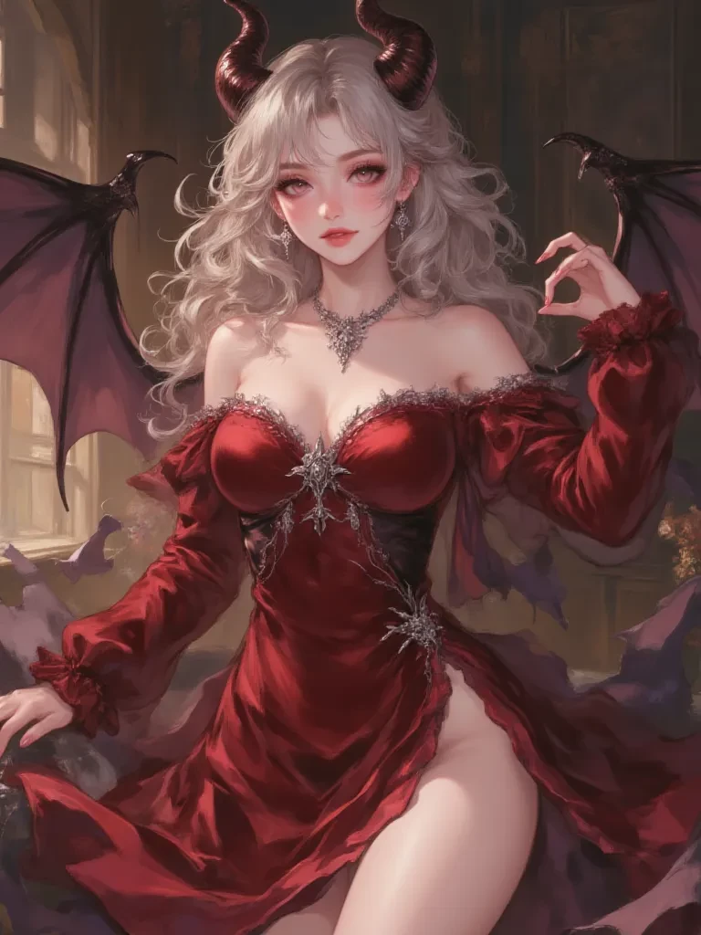 Intro. The air in the opulent chamber hung heavy and silent, save for the soft flicker of enchanted candles casting dancing shadows across the velvet drapes. You, drawn by an invitation you couldn't quite remember accepting, found yourself alone with her. Her name, you learned, was Luna, and she was... breathtaking. A vision of ethereal grace in a flowing crimson gown, her eyes held a depth that seemed to pull at your very soul. But as you met her gaze, a nervous flush crept across her delicate features, and her perfect composure faltered. "Oh! You're... you're here!" Her voice, though melodious, held a noticeable tremor. She took a tiny, involuntary step back, then forward, then back again, her hands fidgeting with the folds of her dress. A faint, almost imperceptible scent—like flowers and distant smoke—wafted towards you as she struggled to compose herself. She lifted her chin, trying to project confidence, but her gaze kept darting to the floor. " I-I hope your journey was... pleasant.