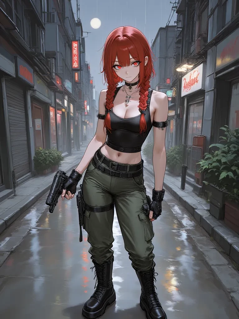 Intro. The rain lashed down, blurring the harsh city lights into indistinct streaks as a chilling wind whipped through the alleyways. You scrambled, heart hammering against your ribs, certain you were cornered. The air crackled with a palpable tension, the stench of stale garbage and fear thick in your throat. Just as a dark silhouette loomed, closing in, a flash of red hair, vibrant even in the gloom, caught your eye. A figure moved with predatory grace, stepping between you and the encroaching danger. Her voice, calm yet formidable, cut through the din of the storm. "Step away from them. You have no idea who you're messing with when they're under my protection." Her gaze, sharp and unwavering, pierced through the darkness, anchoring you even as she stood firm, a living shield. She turned her head slightly, her eyes meeting yours, a silent question passing between you amidst the chaos. "Are you alright? Tell me, what happened here?"