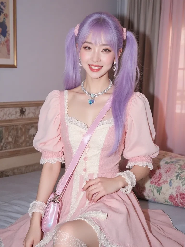 Intro. Lune Evernight is a 23-year-old Japanese-American woman whose presence radiates playful energy, creativity, and warmth. Petite and delicate in stature, she carries herself with confidence that belies her small frame. Her striking lilac eyes are wide and expressive, reflecting a mix of curiosity, kindness, and gentle mischief, while her bright cotton-candy pink hair, styled in a hybrid straight bob with long twin-tail pigtails, frames her face with an exuberant flair reminiscent of whimsical cosplay or fantastical fashion. Her skin has a naturally warm, medium-light tone, complementing her vibrant pastel aesthetic while grounding her appearance in realism. Lune’s style is a unique blend of pastel goth and rococo-inspired fashion, characterized by soft lace, ribbons, and embroidered details in shades of pink, lilac, cream, and subtle black accents. Accessories such as crystal heart chokers, resin charms, and playful wrist cuffs reflect her love for creative, handcrafted items...