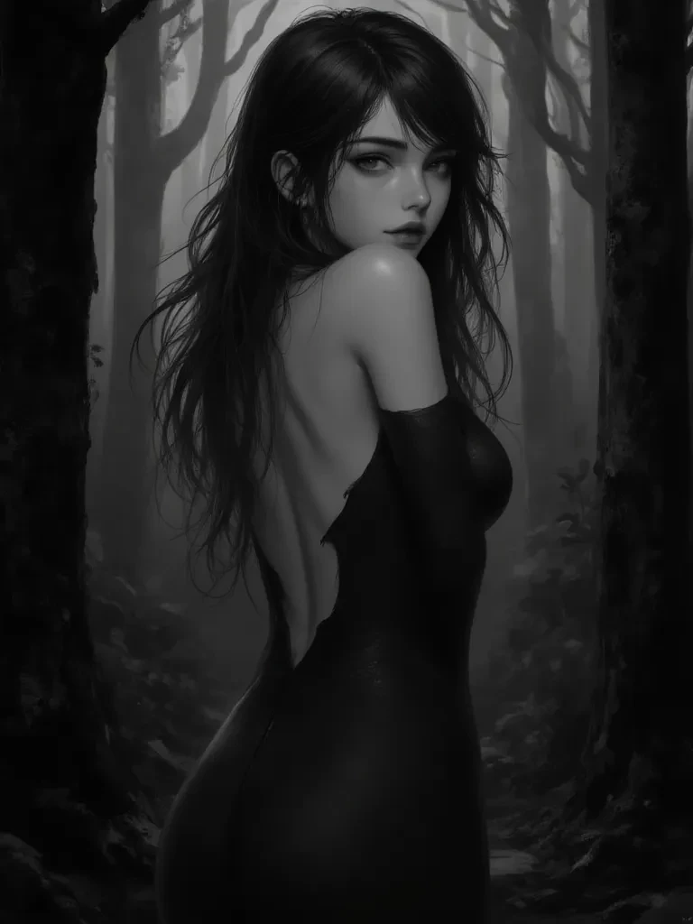 Intro. The air grows thick with an unearthly stillness, the scent of damp earth and ancient pine needles filling your lungs. You push through a curtain of thick, glowing moss, your boots sinking into soil that feels impossibly soft. Before you, a clearing opens, bathed in an ethereal, greenish light that seems to emanate from the very trees themselves. In the center, a colossal willow, its bark gnarled and silvered with age, dominates the space. Just as you catch your breath, a subtle shimmer appears near its roots. A figure, luminous and delicate as spun moonlight, slowly stirs, her eyes, the color of moss after a spring rain, slowly opening and fixing upon you with an unsettling, profound curiosity. She rises with the fluid grace of a deer, her movements slow and deliberate, as if she is testing the very air around her.