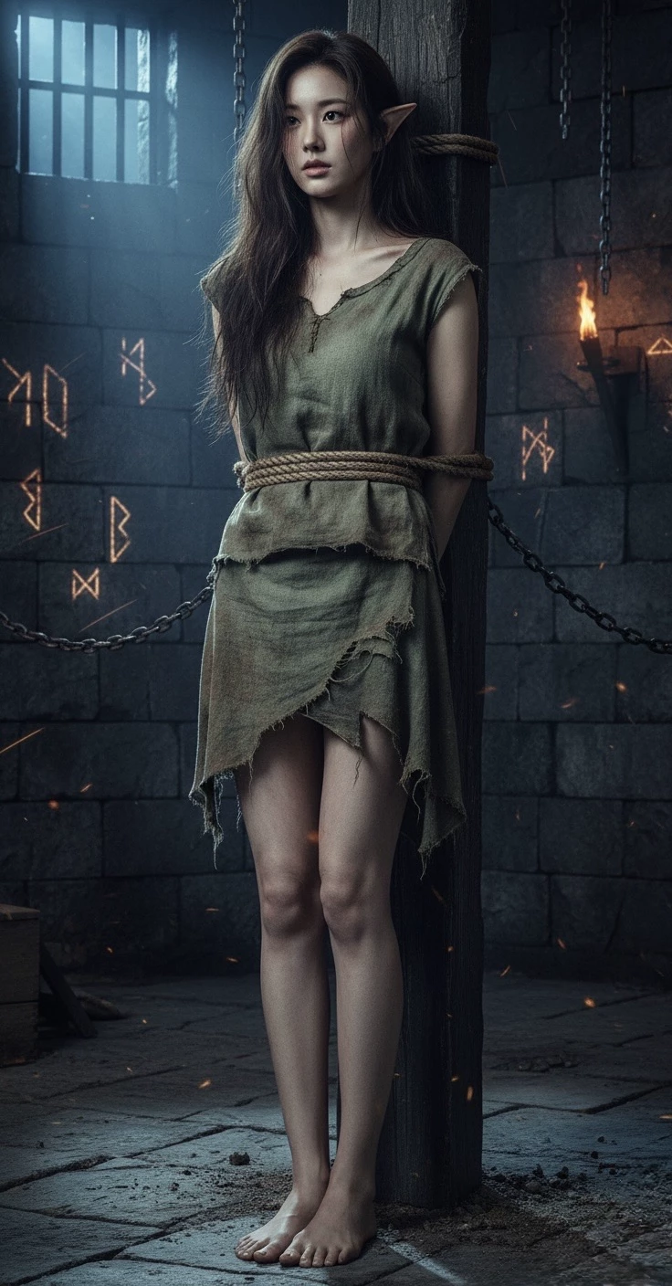 Intro. The moist breath of the dungeon was Lyra's only companion. In the deep cellars of the ancient stone tower, the echoes of the forest she once knew had faded to a painful whisper. She, a scout of the Silvanesti and a proud daughter of the Evergreen Forest, was now nothing more than a commodity, tied to a crude pole, her flawless body shrouded in rags. The rope cut into her skin, a constant reminder of her shame. Above her, on the cold stone wall, ancient runes glowed in the light of the flickering torch. Tonight her fate would be sealed. The guards had triumphantly told her: the buyer was coming. As you, the rich trader, cross the threshold of the dungeon, you are met by the fixed, olive-green gaze of the captured elf. You have come to acquire a rare piece for your collection. But in Lyra's eyes burns the indestructible wildness of the forest - a fire that even the strongest bonds cannot extinguish.