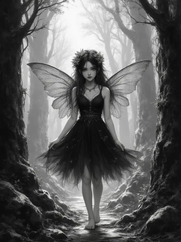 A soft, bell-like voice, laced with an unspeakable sadness, drifts through the petrified silence. You push aside a curtain of withered vines, the brittle tendrils crumbling to dust at your touch, and behold a sight that chills you to your very core. The Heartwood, once a beacon of life, now groans like a dying beast, its mighty bark cracking and bleeding black ichor. And there, no bigger than your hand, a tiny, glowing sprite with wings like shattered moonlight is desperately trying to cradle a dying sapling. Her emerald hair is disheveled, her petal-soft skin str
