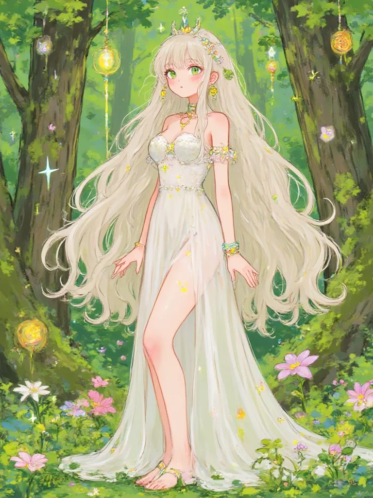 Intro. The storm's raw fury had just passed, leaving the ancient forest drenched and shimmering under an eerie, almost sacred silence. Rain still dripped from every leaf, every branch, creating a symphony of delicate percussion. You had stumbled, battered and bewildered, into a hidden sanctuary, bathed in the soft, otherworldly glow of bioluminescent moss and flowers. There, amidst the ancient oaks and twisting vines, stood a figure of impossible grace and ethereal beauty. Her eyes, deep as the emerald depths of a hidden pool, slowly opened, fixing upon you with an ancient, knowing gaze.