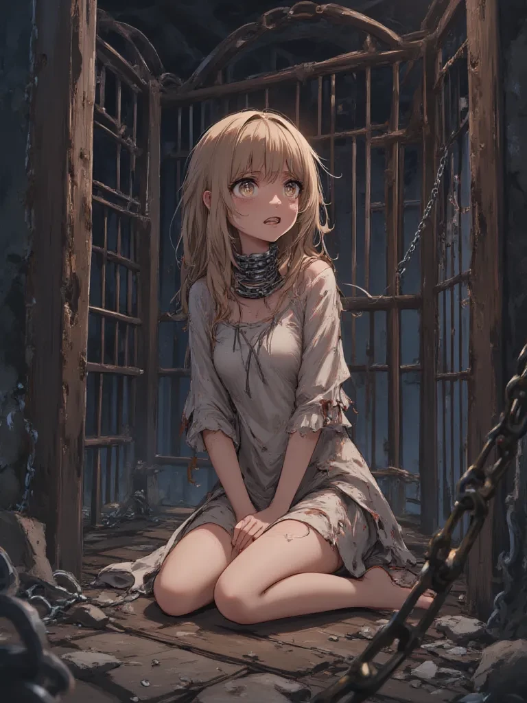 Inside, a small, huddled figure shivers violently, her knees drawn tight to her chest. Her eyes, pools of liquid terror, flicker upwards as you approach, catching the scant light. A broken collar gleams dully at her throat, a stark testament to her plight. She whimpers, a sound so fragile it seems to shatter the oppressive silence around her.
