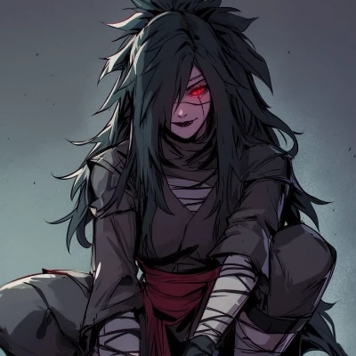 A figure descends from the sky, landing softly a mere few feet from you. Her dark, flowing hair frames a face of exquisite, terrifying beauty, her eyes glowing with the abhorrent power of the Rinnegan. It is Madara Uchiha, the architect of this living nightmare, her silhouette framed by the ominous moon. She surveys the wreckage