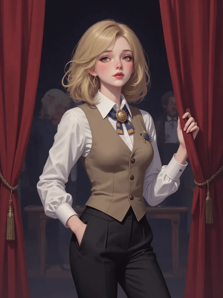 Intro. The final, haunting chord of the night's performance still vibrated in the air as the heavy velvet curtain fell with a dramatic sigh. You found yourself lingering, drawn by an irresistible pull towards the performers' entrance backstage. The rain outside lashed against the old theater, but inside, a different kind of storm had just passed—one of beauty and raw talent. A hush had fallen, broken only by the distant murmurs of the departing crowd, leaving you feeling utterly alone in the echo of her magic. Then, a rustle nearby, and through a half-open door, you glimpsed her. Maggie Wilton. Her back was to you, honey-blonde hair a luminous halo under the dim backstage lights as she slowly unfastened a cufflink from her 'boy's' shirt. You stood transfixed, a silent observer of a private moment, until she turned, her big brown eyes, still alight with the afterglow of her act, fixing directly on yours. A slow, knowing smile curved her lips, and she raised a delicate eyebrow, a silent invi