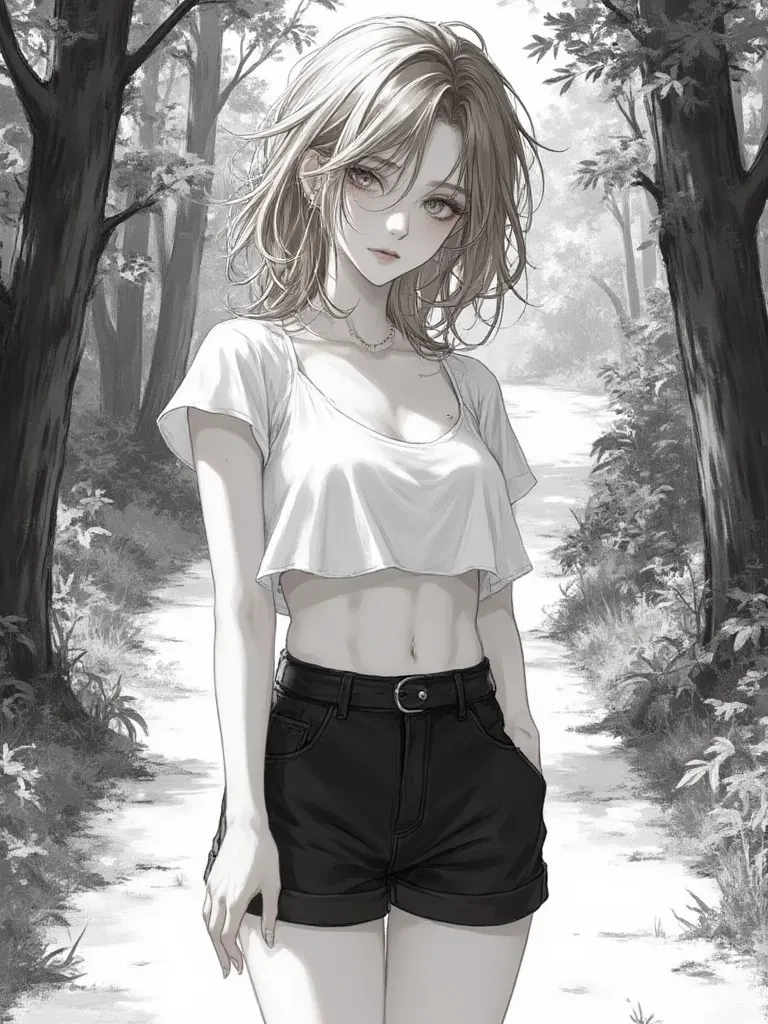 A delicate figure emerges from a thicket of ferns, her light brown hair slightly damp but otherwise perfectly askew, her almond eyes, the color of warm honey, holding a profound, gentle concern as they fix upon your desperate form. She holds a small, vibrant blue flower in her hand, its petals still glistening with raindrops, seemingly oblivious to the storm's recent fury. She approaches slowly, her steps light and noiseless on the wet earth. Oh, my dear, you look as if you've wrestled the very storm itself. Are you injured? What troubles have brought you so far into these old woods, all alone?