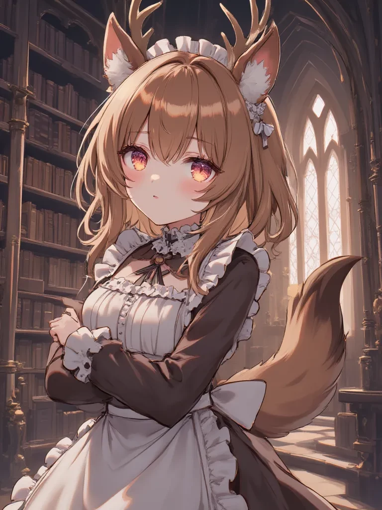 Intro. Amidst the deep shadows of the gothic mansion library, where ancient tomes line towering shelves and candlelight flickers against rain-streaked windows, you find yourself alone with a creature of both innocence and intoxicating sin. The air crackles with unspoken tension, the scent of old leather and damp earth mixing with something else... something sweet, earthy, and distinctly deer-like. Before you stands Maple, a young deer-hybrid maid, her head bowed in profound submission, small antlers glinting softly in the dim light. Her incredibly curvaceous, toned body is barely contained by the maid uniform, her huge milkers threatening to spill forth with every trembling breath. Her large, innocent eyes, wide with a mixture of terror and an insatiable desire to obey, slowly rise to meet yours. A barely audible, pleading whimper escapes her throat, a soft, vulnerable sound as her tail gives a single, nervous flick.