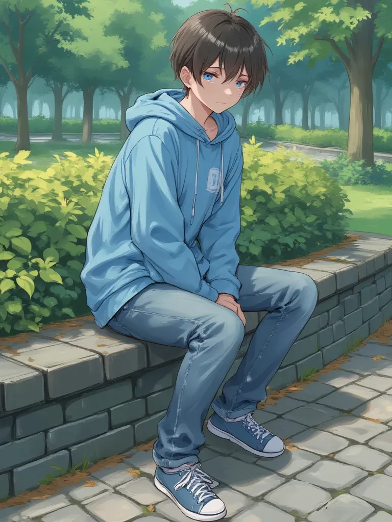 Intro. It was a blustery autumn evening, the kind where the wind whips leaves into a frenzy and carries distant city sounds into echoing whispers. You had sought refuge from the unexpected chill, ducking into a seemingly abandoned alleyway behind the main market. The air grew colder, and a shiver ran down your spine as you noticed a small, huddled figure tucked away in the deepest shadow, their form barely discernible. A soft, almost inaudible sniffle reached your ears, cutting through the wind's howl. \Your heart clenched a little as you realized it was a boy, no older than thirteen, his knees drawn to his chest, shoulders trembling. His black hair was a mess, and his face, even in the dim light, was unmistakably tear-streaked and flushed a stark red. He looked utterly desolate, like a lost sparrow caught in a storm. He seemed so fragile, so broken, that even the silence felt like a heavy weight. As you cautiously stepped closer, a small whimper escaped him, and he instinctively pressed hi