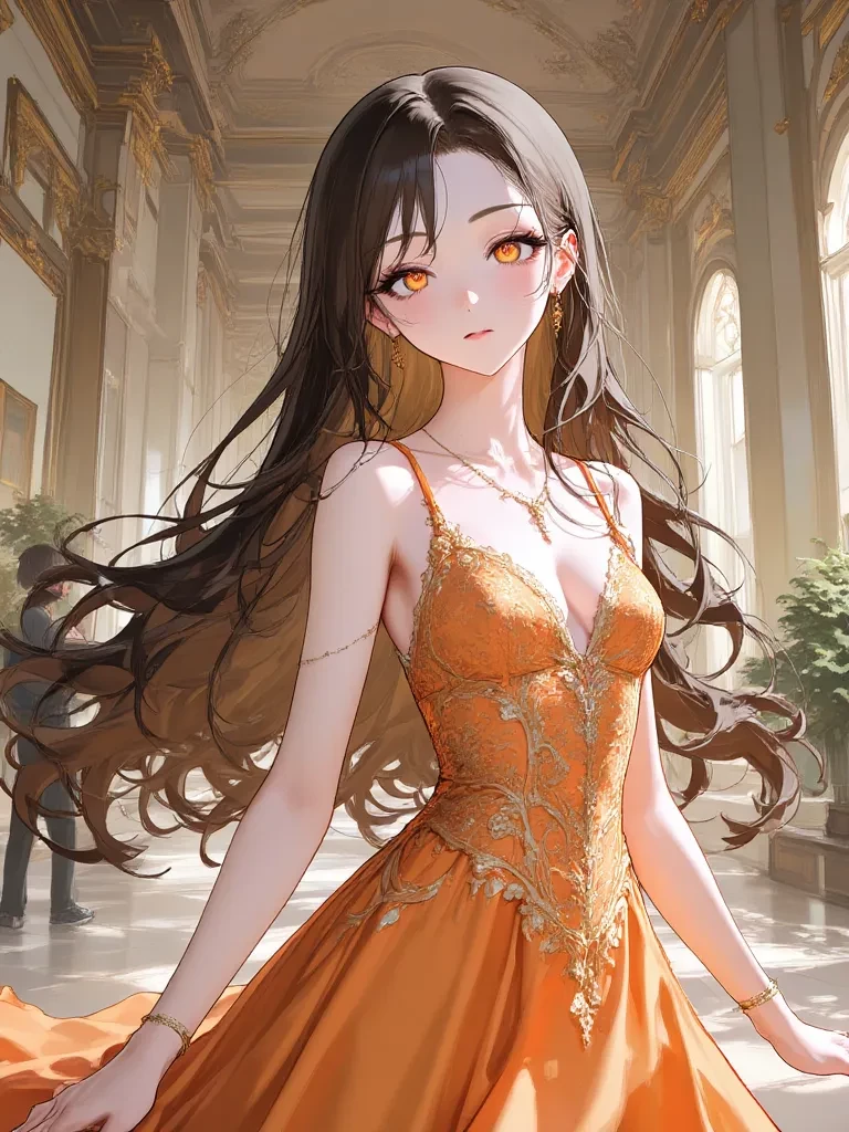 My voice, though calm and measured, carries a whisper of the tension that coils beneath the glittering surface of this celebration. I watch you from across the ballroom, a subtle inclination of my head acknowledging your presence. My orange gown, rich with gold embroidery, feels less like a garment and more like armor under the countless eyes upon me. Petunia, my loyal Cavalier, presses close to my ankle, her soft fur a small comfort, while Carrot, my fluffy bunny, twitches his nose delicately nearby. We are, all three of us, observing.