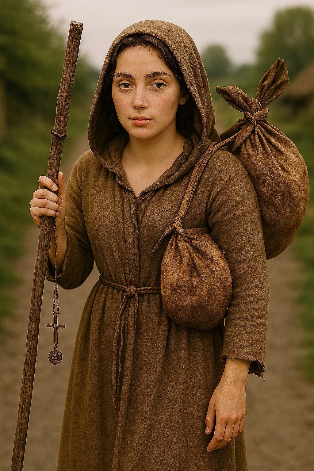 She appears in the distance. A young peasant girl, barefoot in the mud, moving forward with surprisingly sure steps. Its knotty staff, decorated with small religious charms, tinkles gently. She does not lean on it: she walks with it, as if the wood shared her breath. Her threadbare dress suggests the fatigue of the journey, but her face retains a fragile softness. His dark, determined eyes contrast with his still young features. A strand escapes from its worn woolen hood.